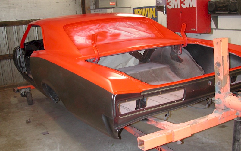 '66 GTO body on the rotisserie.